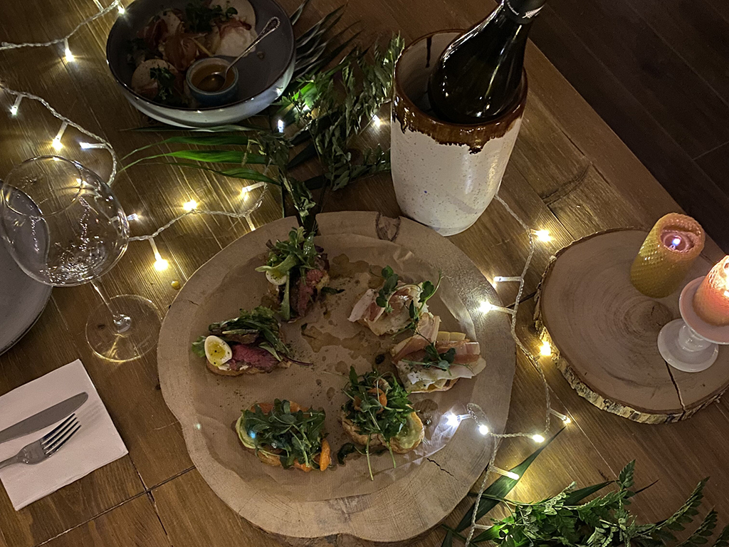 Во втором зале для вас будет накрыт стол - закуски и вино от ресторана "Гренок", сам шеф-повар ресторана приезжает, чтобы засервировать стол. А на время ужина только для вас двоих будет играть музыкант (скрипка или саксофон).