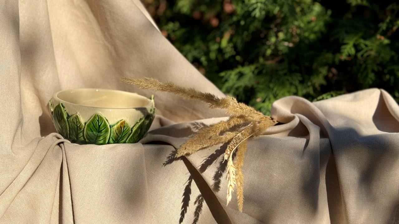 На этом мастер-классе вы за гончарным кругом выкрутите миску, а потом наклеите внутрь листья, которые сделаете вручную. Можно воспользоваться шаблонами, а можно придумать форму листьев самостоятельно. Внешнюю поверхность салатника можно дополнительно задекорировать фактурой коры. С помощью молочения глине придается мягкий коричневый цвет, и узор становится просто восхитительным.